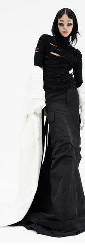 Marc Jacobs's Spring 2022 Ready-To-Wear collection was the perfect blend of the present and future. With the long sleek skirts and astray pieces of fabric, the collection brought me back to the fashion of the 2021 hit, Dune. Looks 1 and 2 embodied the futuristic sand brown outfits of the Fremens. The futurism intertwined in this collection is most apparent through the complimentary makeup and hair. The bold white and black smoky eyes almost come off like a pair of sunglasses. The simple colour palette of white and black helps to reinforce the minimalistic aura of the future. The collection is made up of a variety of interesting textures including denim and puffer coats. The asymmetric cut knitwear makes quite the minimalistic statement. It was a small yet comprehensive collection.